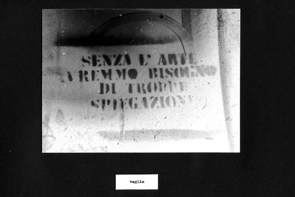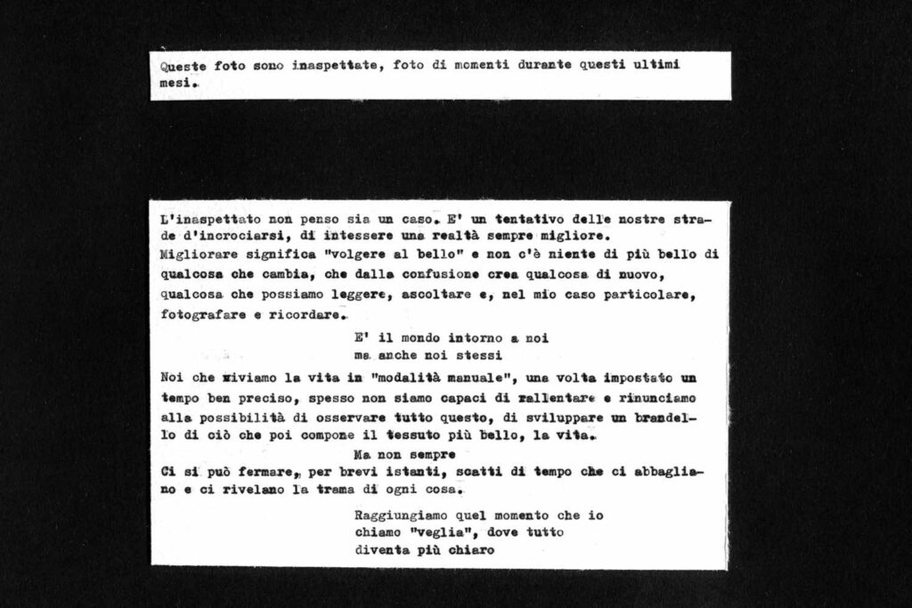 Fermarci, per brevi istanti, scatti di tempo che ci abbagliano e ci rivelano la trama di ogni cosa. Così tutti possiamo raggiungere quel momento che io chiamo “veglia”, dove tutto diventa più chiaro.